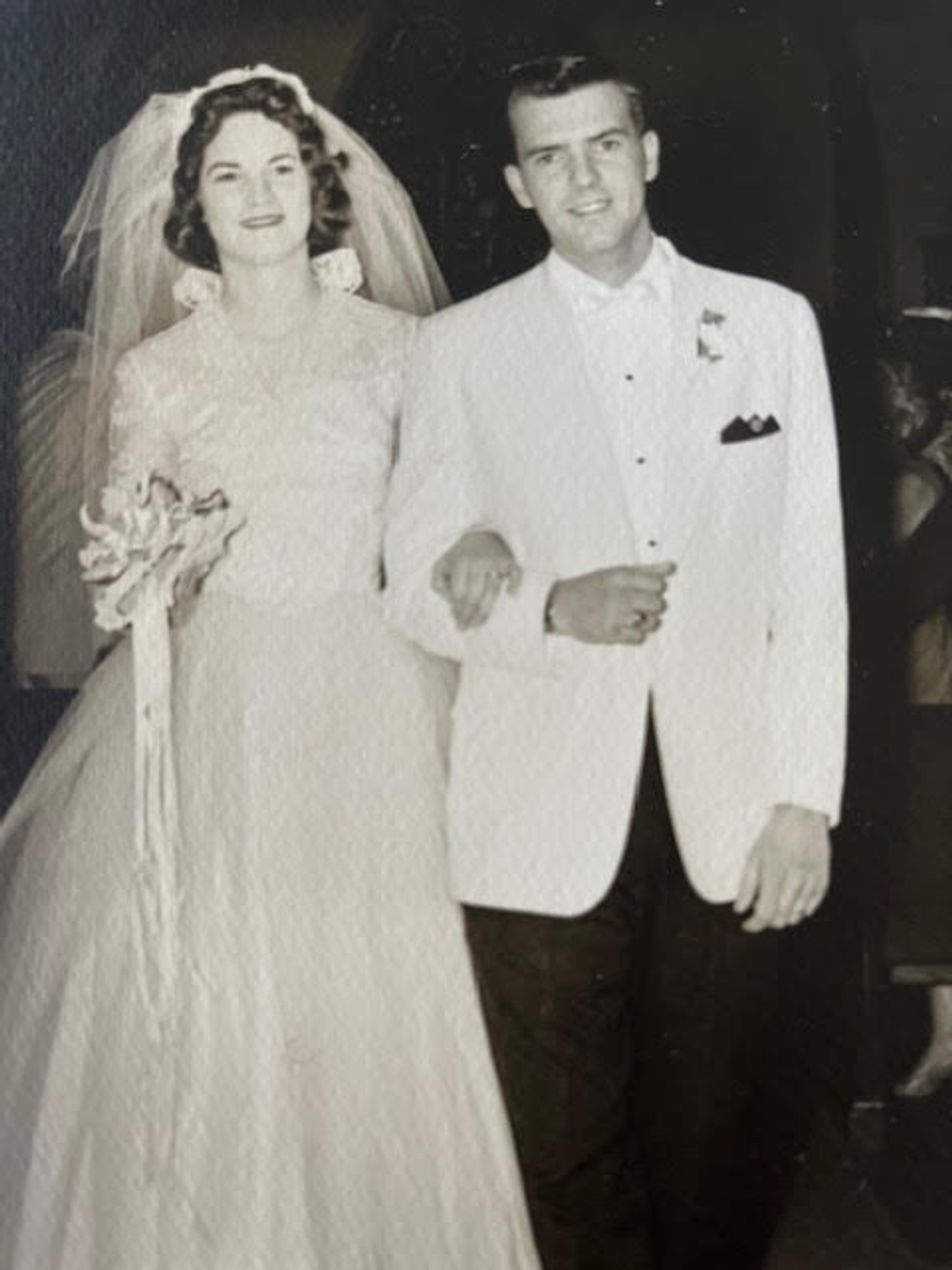 Diane, who describes herself as practical, is from a large family which includes seven siblings. While planning the wedding, which took place in 1963, she worried over expenses, so she recycled a dress which had belonged to one of her sisters. When her sister wore the dress ten years earlier, hoops were in style for brides of the times. But when it was Diane’s turn, she swapped out the expansive skirt to reflect the clean-lined styles of the early 1960s. “I wore the dress without a hoop,” she said, explaining that her mother, a skilled seamstress, assisted her with perfecting the headpiece.