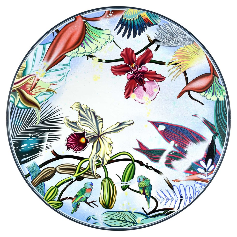 At the heart of the exhibition is a four-foot-diameter hand-painted “Orchid Oculus Tondo,” surrounded by four hand-embellished prints and a shimmering cut-glass mosaic. The central painting conjures a dreamlike cosmos where endangered St. Lucian parrots glide through oversized tropical orchids and foliage. Built through a “call-and-response process” that allows drips, spills and chance encounters to remain visible, the work is alive with motion and improvisation. In the depths of winter, “Oculus Serenade” offers a kind of visual warmth, a reminder of the beauty, fragility and music of the natural world.