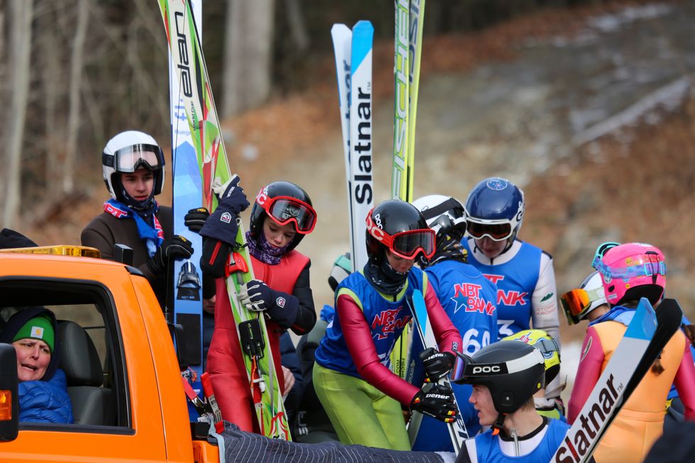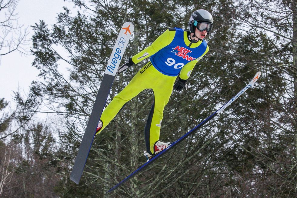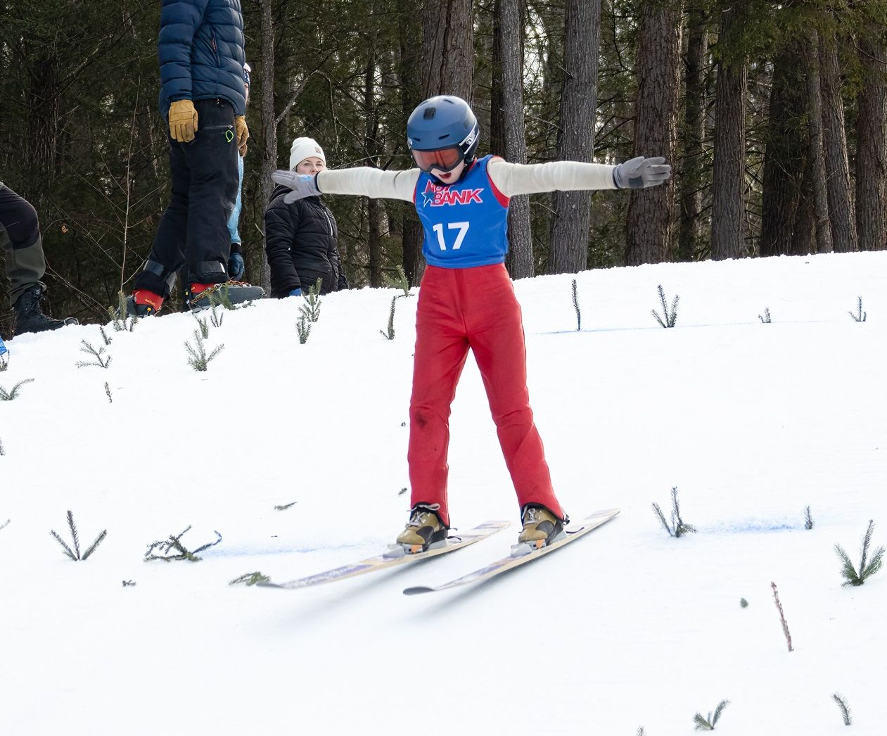 Youth ski jumpers gather at the landing zone to recognize the national anthem before the Eastern U.S. Ski Jumping Championship began at Satre Hill.Lans Christensen Henry Loher flew farther than any other competitor at Jumpfest 2025, gliding 71meters on Sunday, Feb. 2.Randy O’Rourke