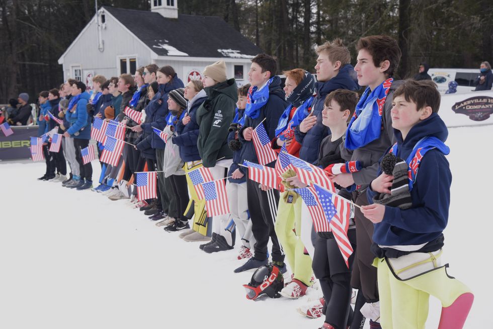 Youth ski jumpers gather at the landing zone to recognize the national anthem before the Eastern U.S. Ski Jumping Championship began at Satre Hill.Lans Christensen