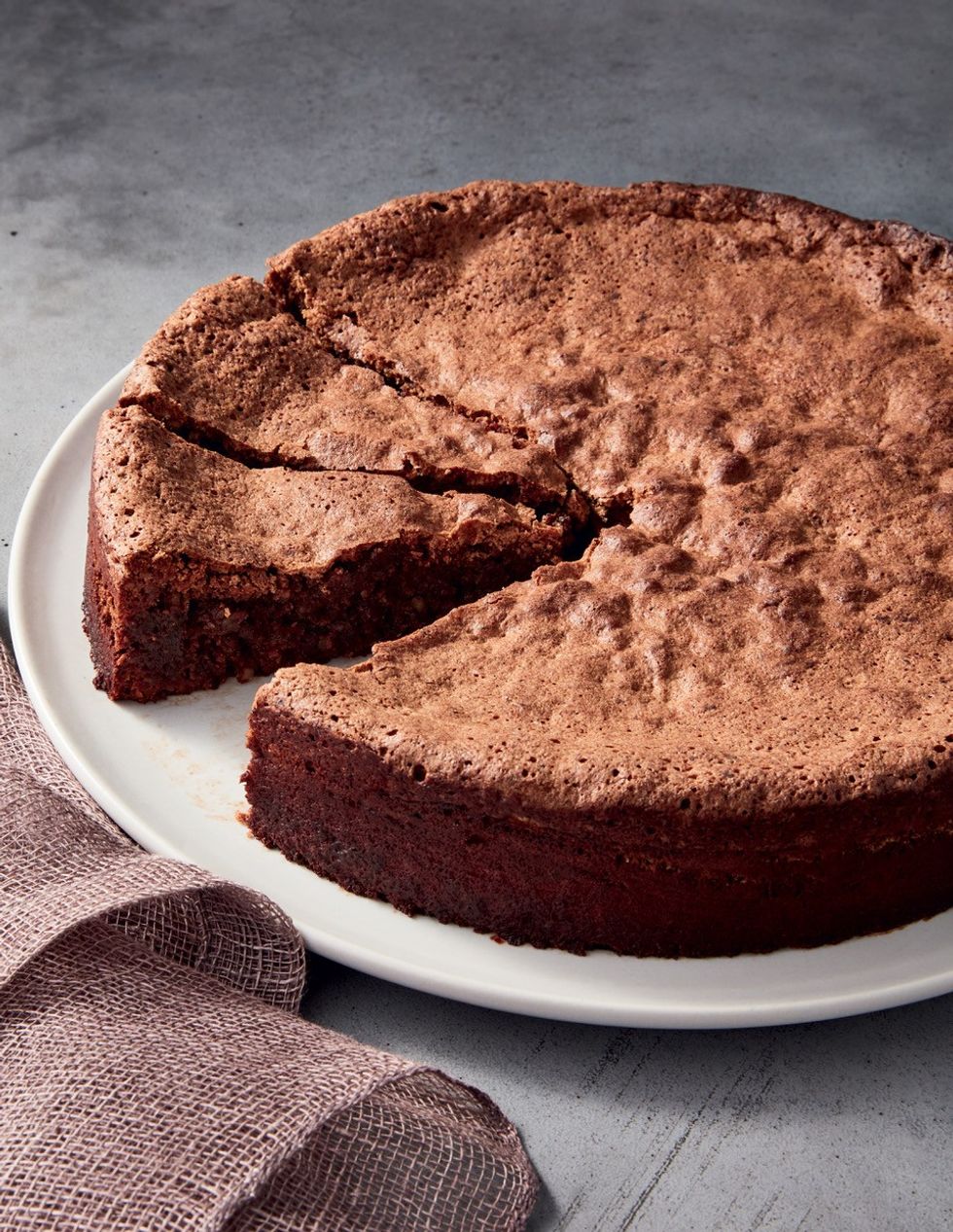 This is the kind of cake served in Italian caffès, French bistros and Austrian coffeehouses. You can find renditions of it, usually made with almonds, around the Mediterranean and on Passover tables all over the world (there’s no leavening, so it’s perfect for the holiday). It’s a simple, unfussy and unfussed over cake, a slim torte made with just three ingredients: eggs, sugar and nuts (there’s no wheat, so it’s gluten-free). Here I use walnuts, which have a pleasantly bitter side to them. Playing to the nuts’ strengths, I’ve included a few other flavorful ingredients—most important, chocolate and ground coffee (preferably espresso), as well as a touch of cinnamon and vanilla.
