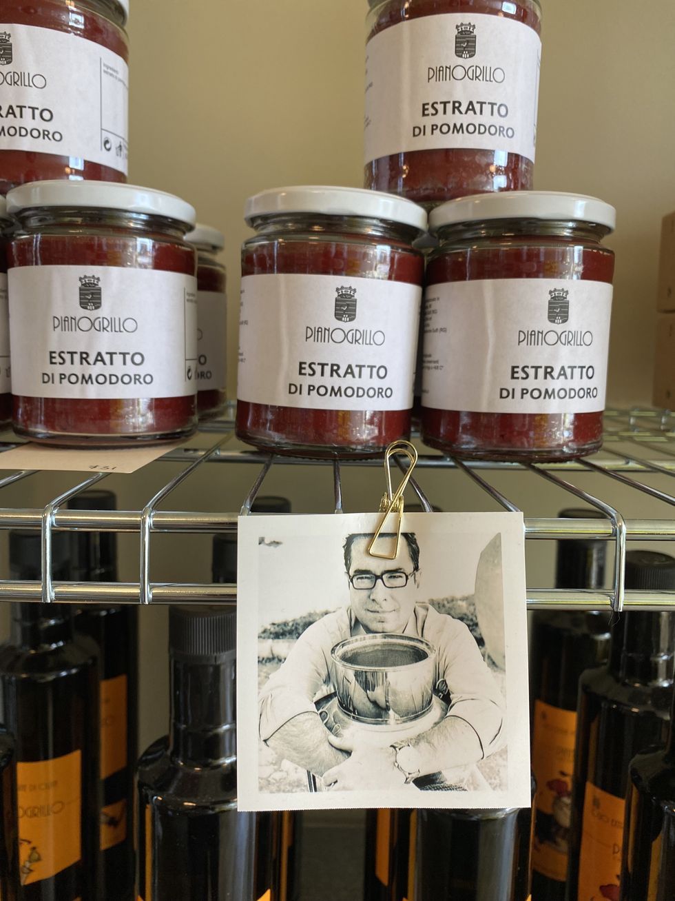 Clipped to some of the shelves are photos of the men and women who produce the artichoke hearts in extra virgin olive oil, and my favorite, the estratto di pomodoro, which is straight up the best tomato paste on the planet.