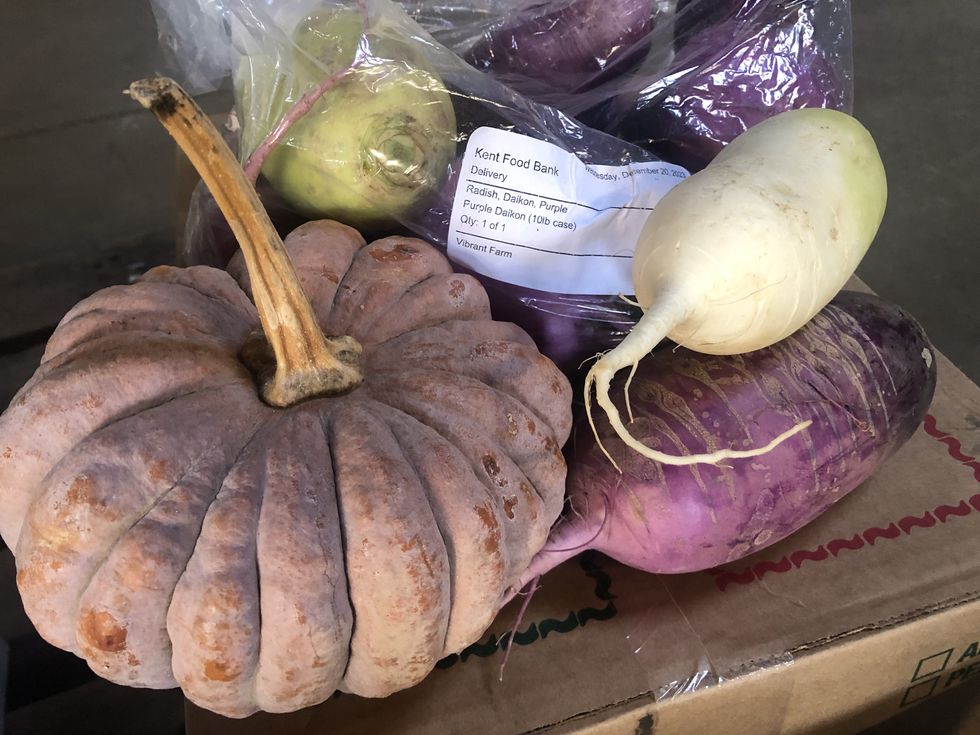 Northwest Connecticut Food Hub director Renee Giroux moving a pallet of regionally grown produce dropped off by farmers, aggregated, and prepared for outgoing delivery to food access organizations.