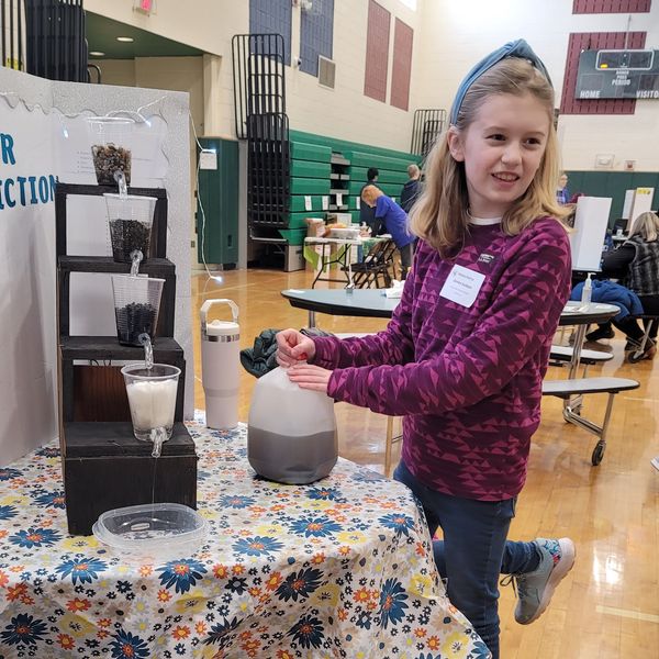 Fourth grader Caroline Eschbach demonstrates her water filtration system. She just turned 10, and lives in Amenia.