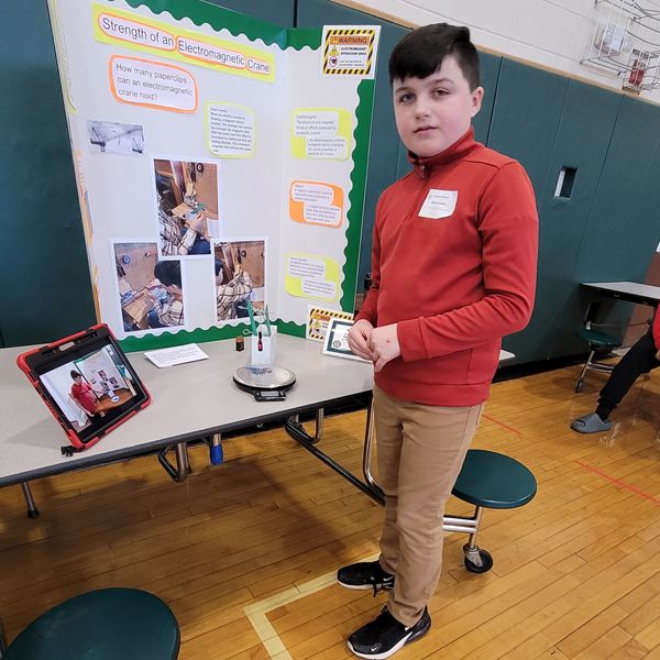 First place: Ryan Morrissey, seventh grade — aerodynamics; second place: Riley Whalen, sixth grade — wind tunnel aerodynamics; third place: Noah Veach, fifth grade — oobleck walkway; honorable mention: Nolan Howard, seventh grade — strength of magnetic crane.