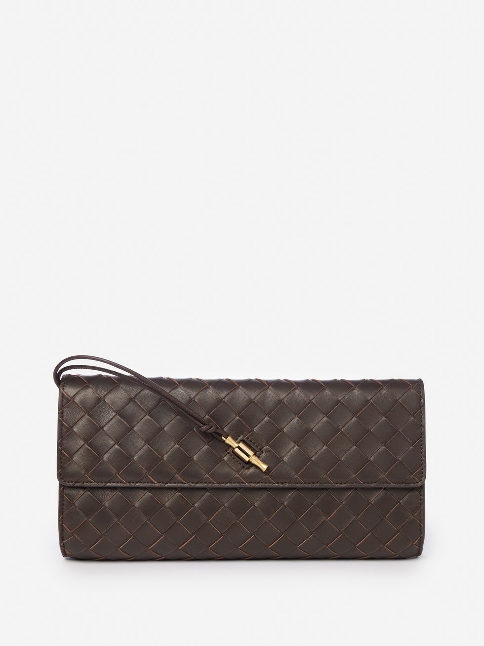 “Designed in rich woven leather, the Pernille puts a unique spin on the evening-ready clutch with an asymmetric, bamboo-style closure.”