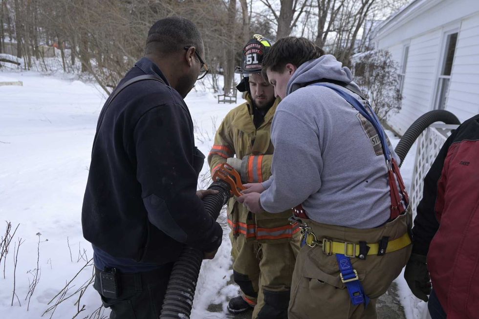 Millerton firefighters manage outflow from a pump they used to remove about six inches of standing water from the basement of the NorthEast-Millerton Library on Tuesday, Feb. 10.