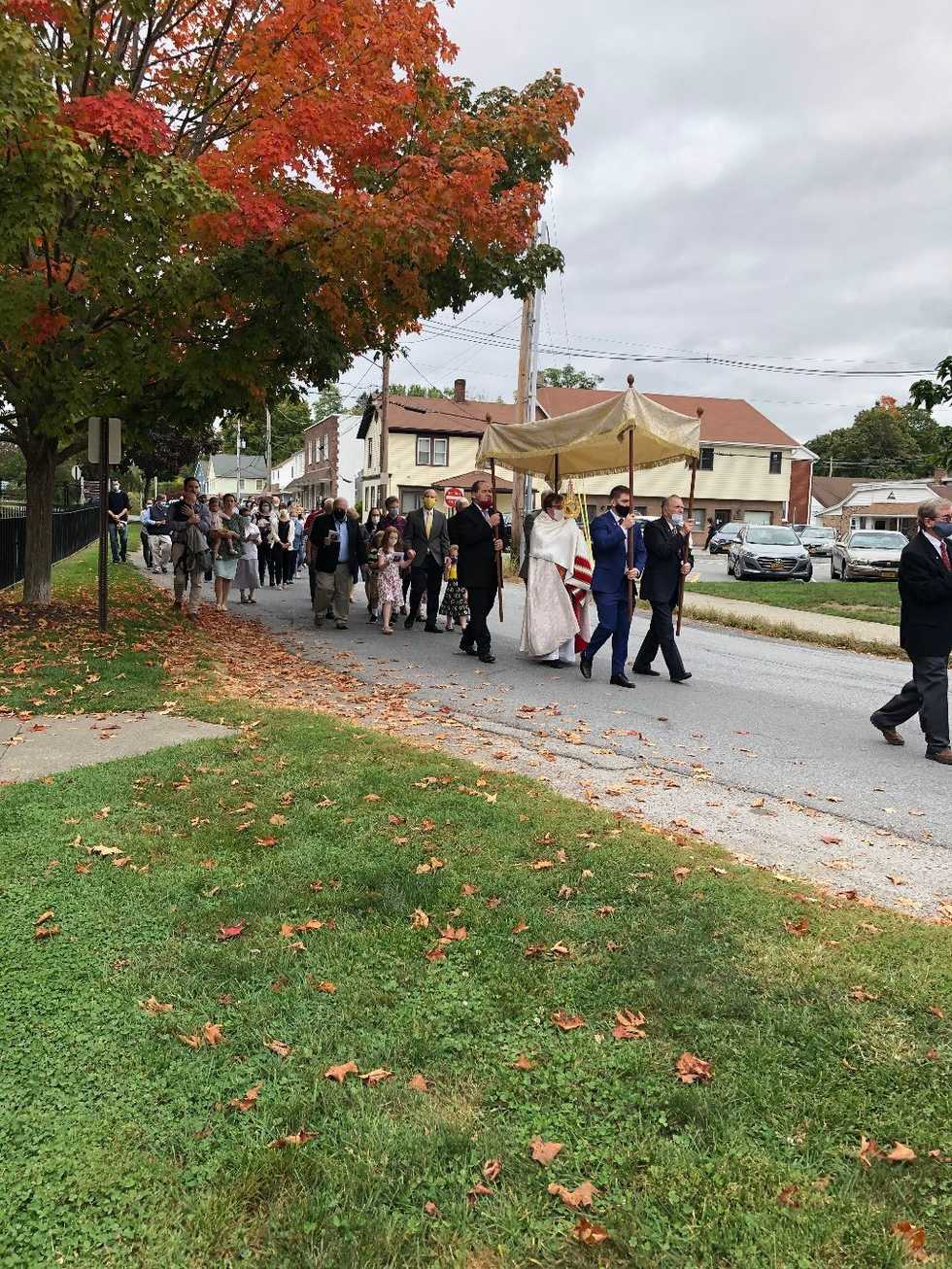 Father Hartley Bancroft, members of the Knights of Columbus, Millbrook Council 381, and the congregation of St. Joseph-Immaculate Conception Church conducted a Eucharist Procession through the village of Millbrook on Sunday, Sept. 27, following the noon Mass. Walking under a canopy held by a number of the Knights, Fr. Bancroft carried the monstrance, which holds the holy host while the crucifix was held by Mike Bell. Singing hymns as they made their way through the village, many stopped to watch and join in, happy for the sense of community during these troubled times and to have the village blessed in this manner. The procession wound its way through the village and back to the church, where a benediction was held. The Knights of Columbus are about 61 strong. They hold community events and help with church projects, including working at Uncle Al’s Thrift Shop, which benefits the church.