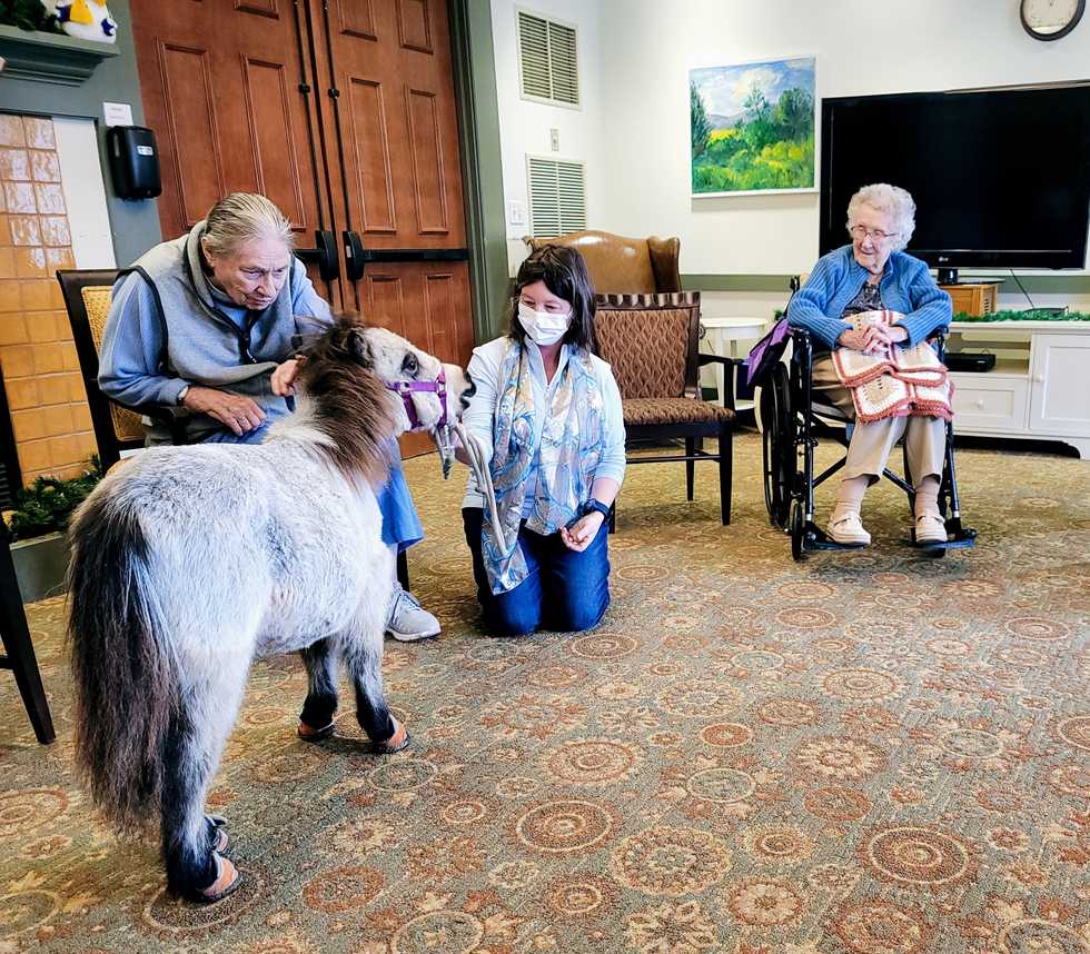 From left, Gerda Thuell reaches out to Baku, a six-month old miniature horse that came to visit at The Fountains on Thursday, Dec. 8. Equine therapist Kelly Lattin and resident Jenifer Thuell look on. photo by Judith O’hara Balfe