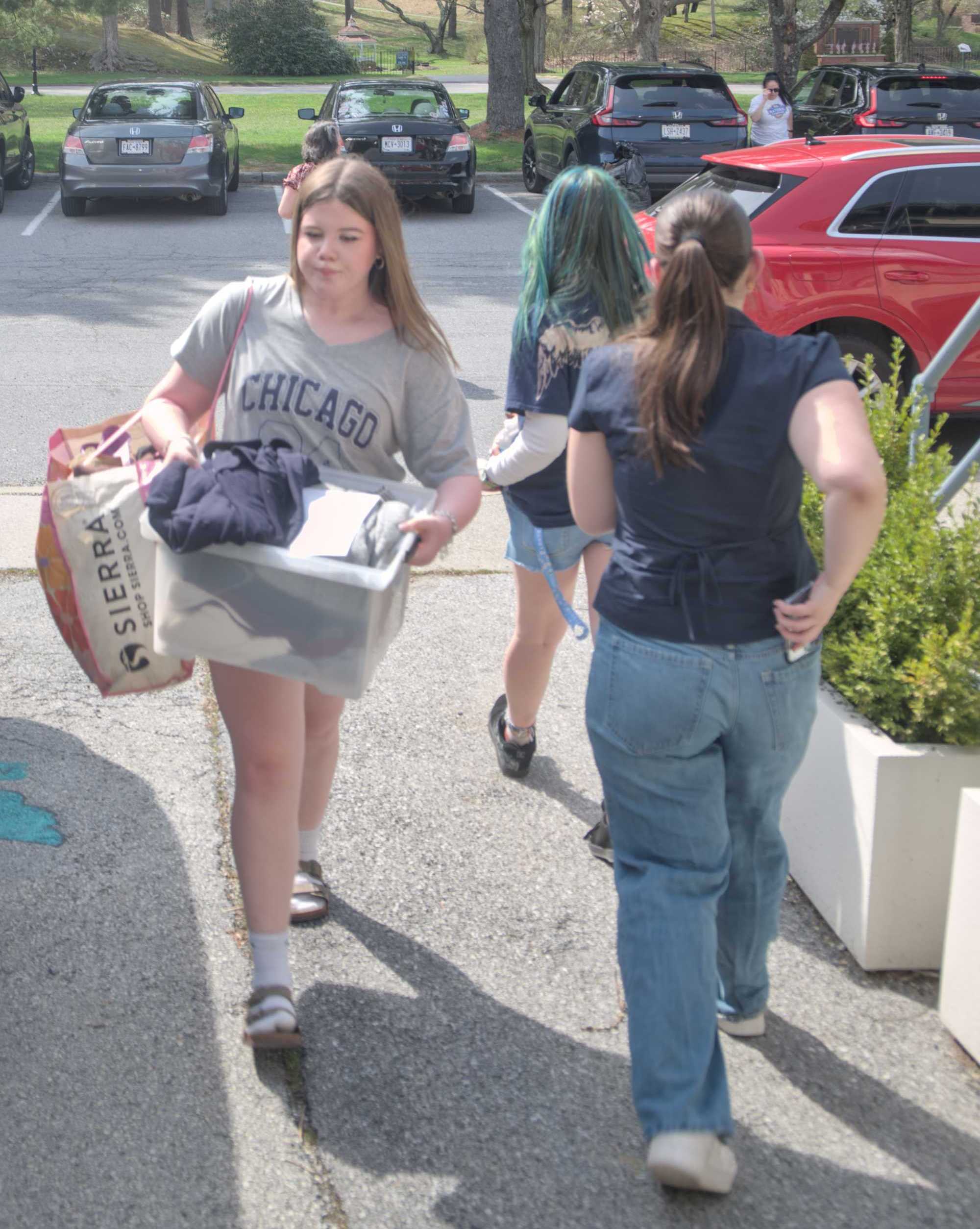 Millbrook High School Interact Club members store donated clothes they collected for Millbrook-based nonprofit Angels of Light to the organization’s office on Front Street near Marona’s Market on Thursday, April 16. The Interact Club runs charity drives and collects donations of clothes for local nonprofits.