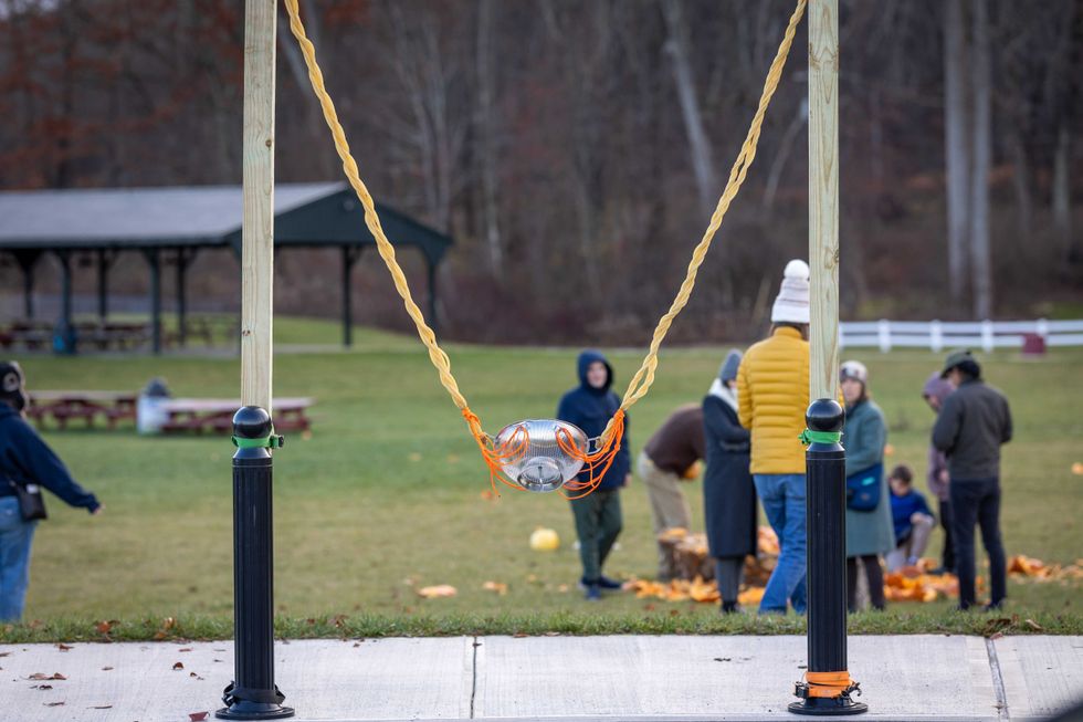 Climate Smart Task Force member Andrew Stayman shows off the homemade pumpkin-launching catapult he built using a heavy-duty metal colander, latex tubing and a custom quick-release rig. Stayman has been engineering the device since September, conducting dozens of test shots using dumbbells. Pleased with the turnout at Eddie Collins Memorial Park Saturday - and the crowd’s enthusiasm - he’s already brainstorming upgrades for next year’s launch.
