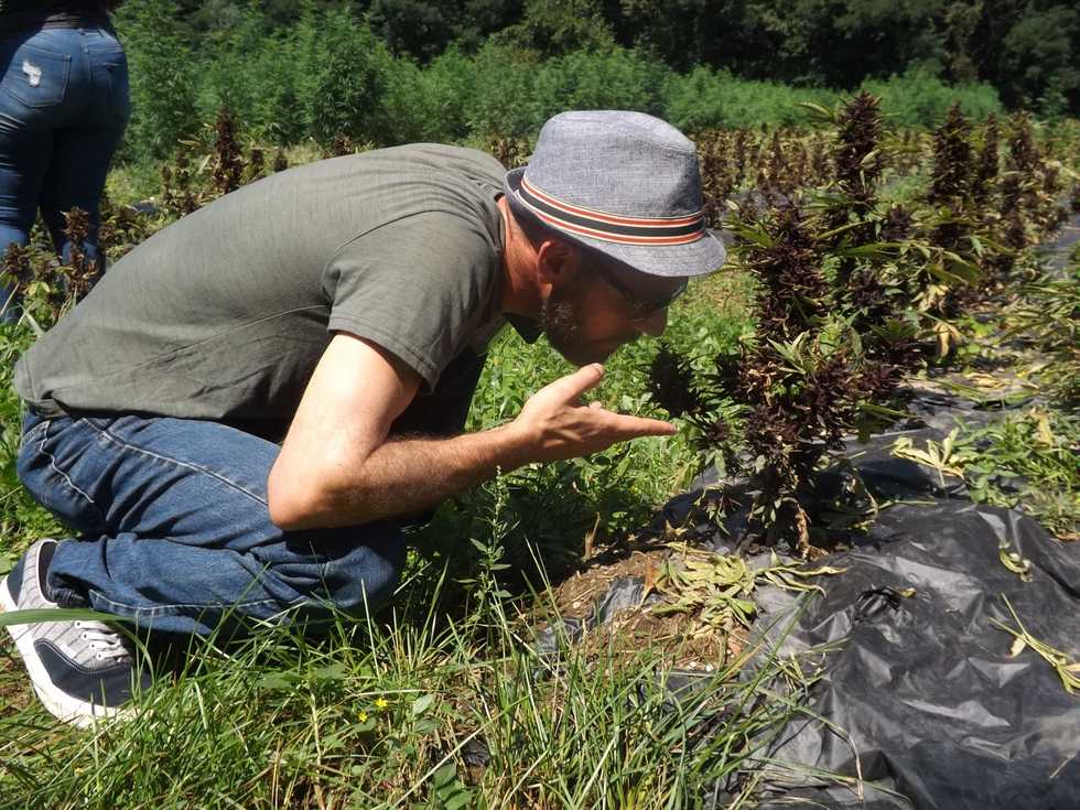 Visiting Millerton from Long Island, Alban June bent down to admire the autoflowers growing in Harney & Sons Hemp Division’s fields.