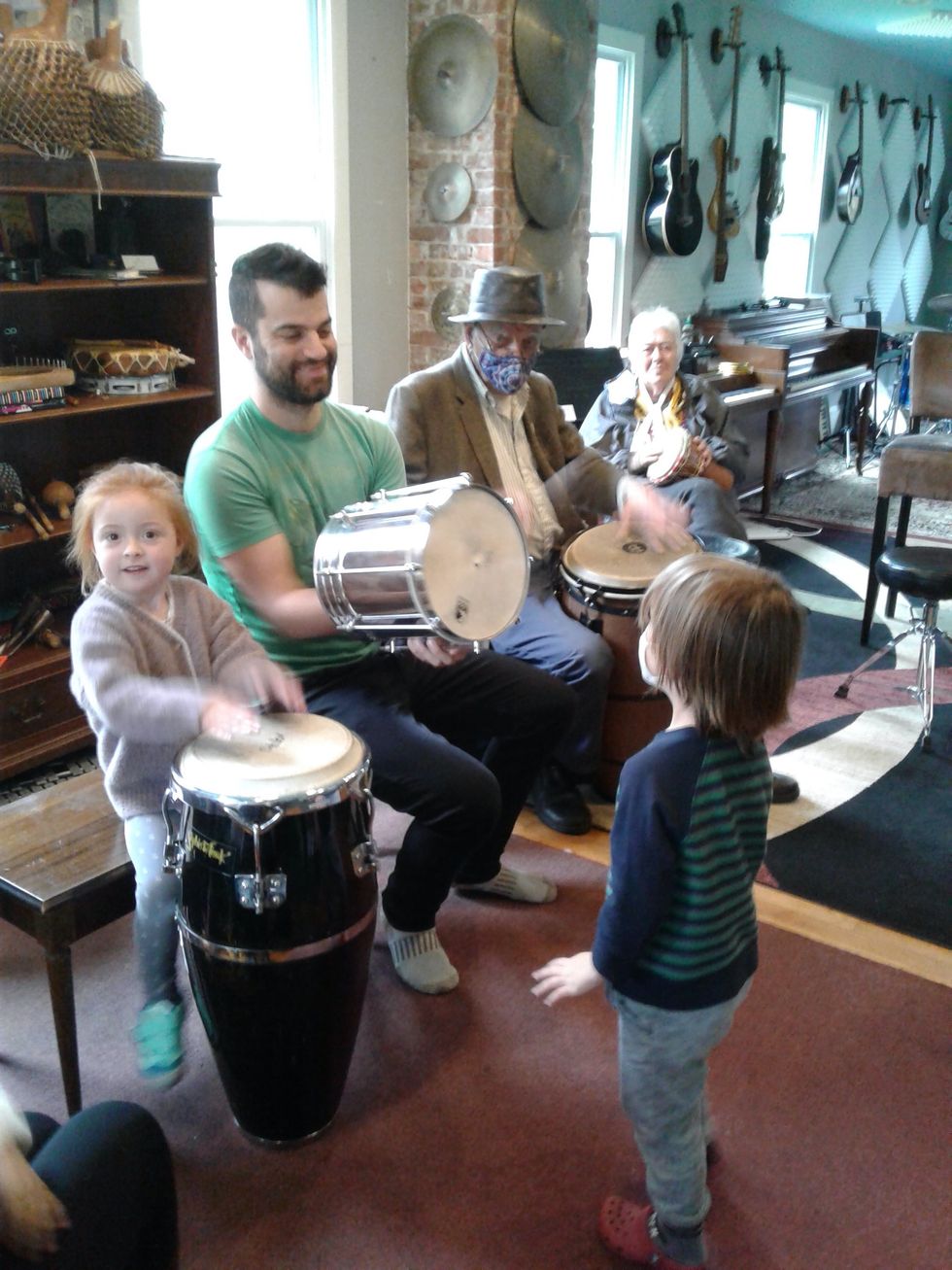 Center, Jonny G, the creator and visionary behind The Music Cellar in Millerton, invited local budding musicians to join him for a photo on the front porch of the building he is now able to call home to his permanent studio thanks to community support, after an invigorating Toddler Jam session.