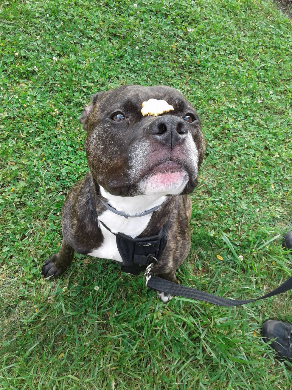 Willing to do a trick to gain a treat, Bellamy, an American bull dog pitbull mix, patiently balanced a cookie on her snout with hopes of eating it afterwards. Photo by Kaitlin Lyle