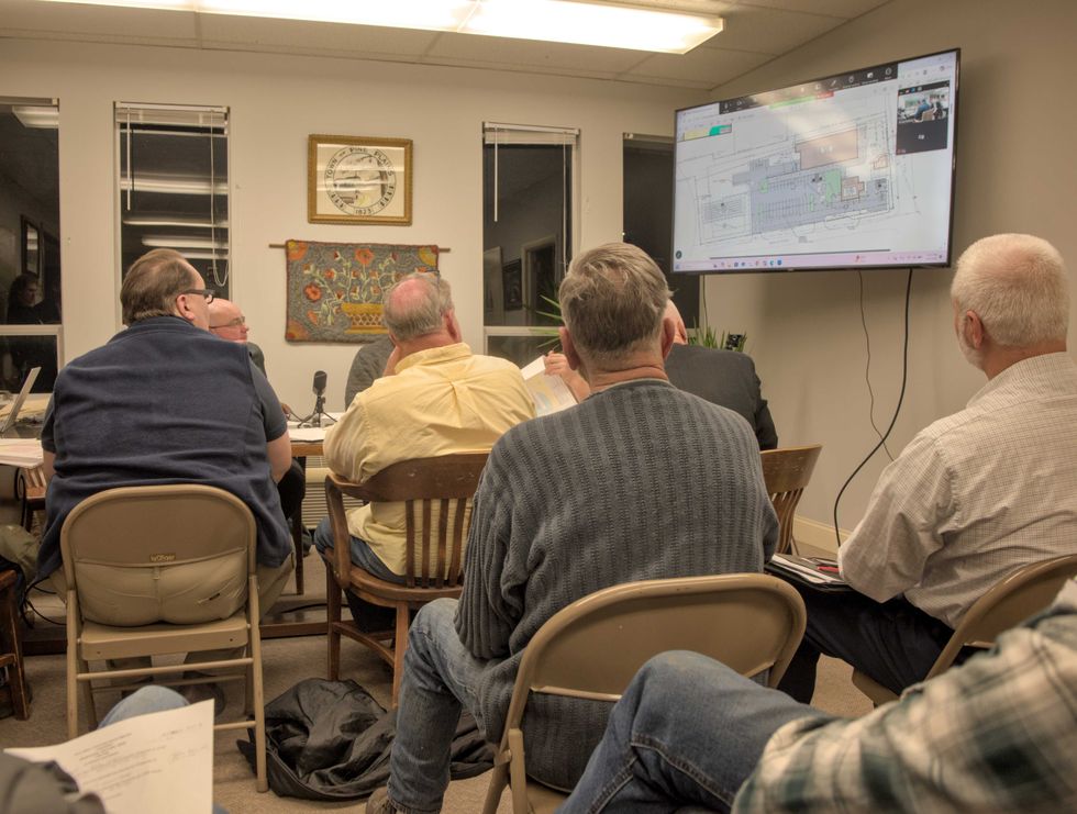 Engineer Zak Hall, left, and architect Kristina Dousharm of Kristina Dousharm Architects present plans to build a new grocery store and renovate an existing building for an ice cream shop at the Planning Board on Wednesday, April 8.