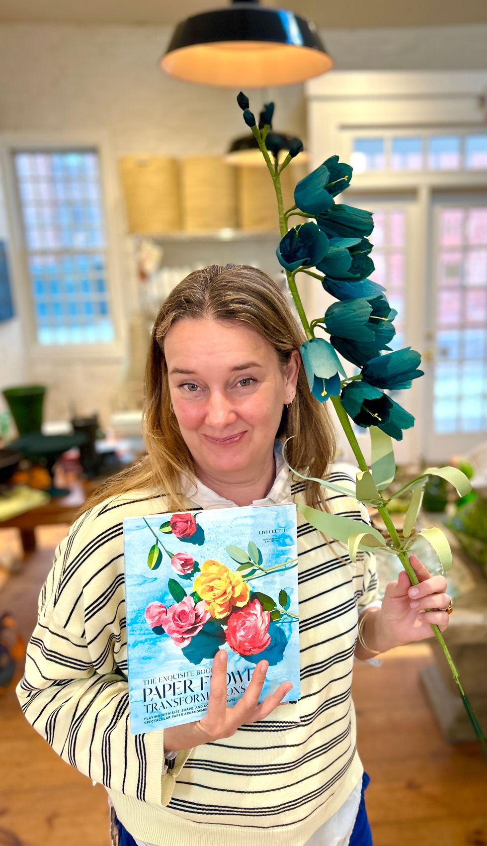 The paper flower workshop at the Milton Market was fun, relaxed, filled with laughter, and the guests created stunning blossoms during the four-hour session. A giant sweep of forsythia blossoms set on a massive central table made a joyous statement that Spring had arrived. Participants enjoyed champagne and snacks. Bobby Graham of Salisbury, who recently left a career at Condé Nast, is about to open a shop (with his husband) in Sharon called Dugazon. He recalled the first Cetti workshop he attended at Milton Market as “kind of wild” with twelve people snipping and folding.