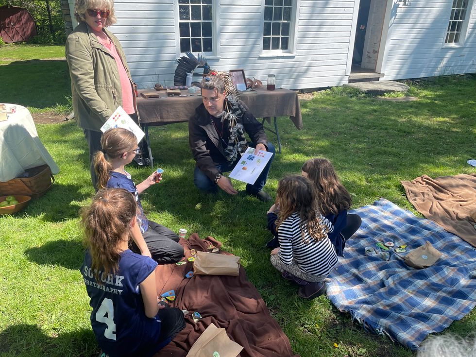 Anne Simmons, standing, offers prompts and suggestions as her granddaughters and other children try to identify the meanings of words and symbols on painted rocks they had collected.  Sachem Hawk Storm kneels in front of a table laden with cultural and ecological artifacts. Photo by Deborah Maier
