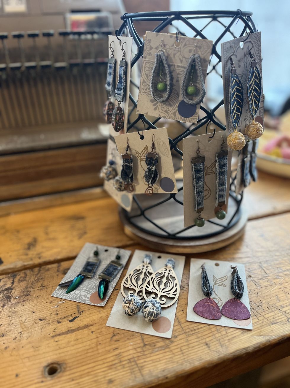 “These are handmade earrings using repurposed textiles, ephemera, and bits and bops by Heather Price, who is an artist living in Chatham. She also happens to be my mom and I’m so proud of her.”