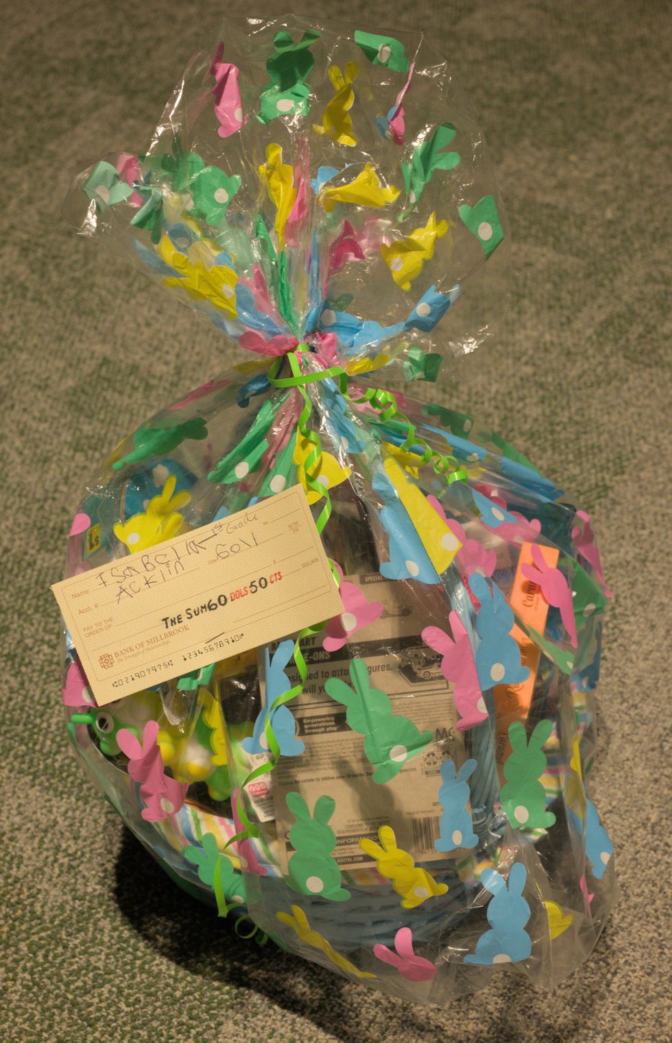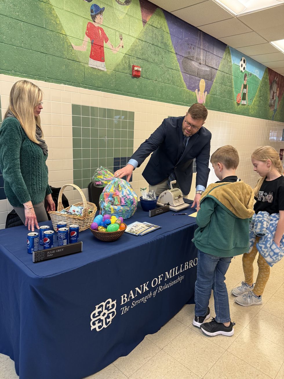 Webutuck elementary student Isabella Acklin, left, won a gift basket at Math & Science night by bidding $60.50. Acklin is pictured here with her mother Amanda Gallagher, Bank of Millbrook Amenia branch manager Mark Vila and Webutuck PTA president Anna Kall, right.