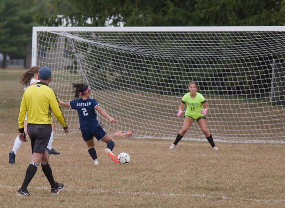 Rosa Mejia, no. 2, found the back of the net to make the Bombers’ only goal of the soccer match against Rhinebeck at Stissing Mountain High School in Pine Plains Wendesday, Sept. 25. Rhinebeck won the match 6-1.Photo by Nathan Miller