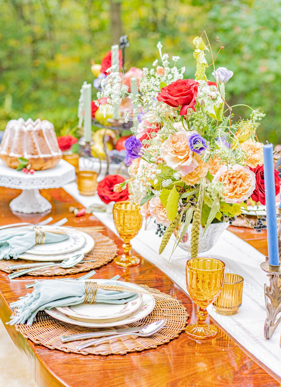 When it comes to the many decorations on your table, Ross is a proponent of the rule of threes. “We are hardwired for odd numbers,” Ross said. Sets of three or five for things like candles or ornaments keep things from being too symmetrical, and create an interesting visual for the eyes to follow. This lack of exact symmetry opens up negative space on the table for guest’s eyes to rest and not be visually overwhelmed. Colors on the table should compliment each other, or directly contrast. Ross encouraged onlookers while adding rose heads to her fruit center piece by saying she is self taught, and that if a ballet dancer could manage to learn all this, so could anyone else.