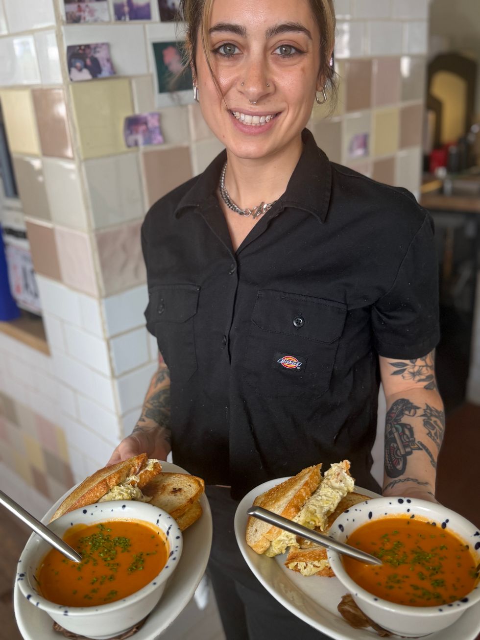 At No Comply Foods in Great Barrington, skate culture, punk music and globally inspired comfort food collide in a pink frame house on Stockbridge Road where community matters as much as what’s on the plate. Opened in 2024 and named for a skateboarding trick, the restaurant hums with eclectic music while its walls double as a gallery of patron-gifted art — brightly colored skateboard cartoons, portraits of the owners’ pug, Honeybun, and offbeat collages.