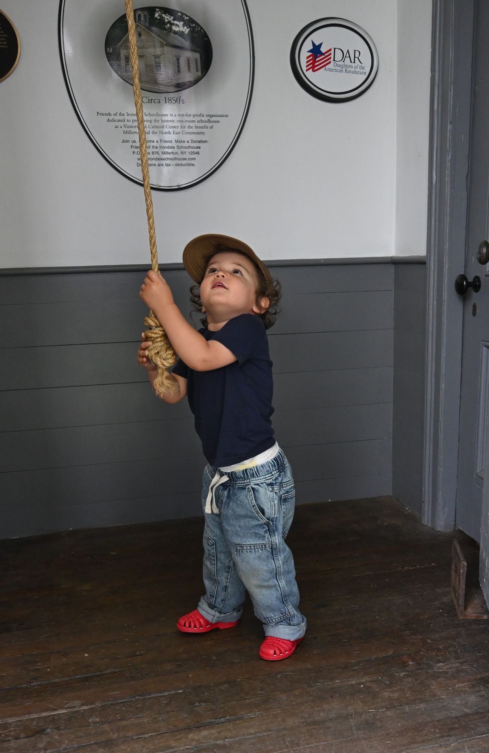 Young and old stopped to make a sundae, and some wandered into the one-room 1850s schoolhouse. Two-year old Raphael Anderer from West Cornwall, who was freshly fueled with ice cream, took a turn ringing the schoolhouse bell, pulling down with both hands before disappearing inside.